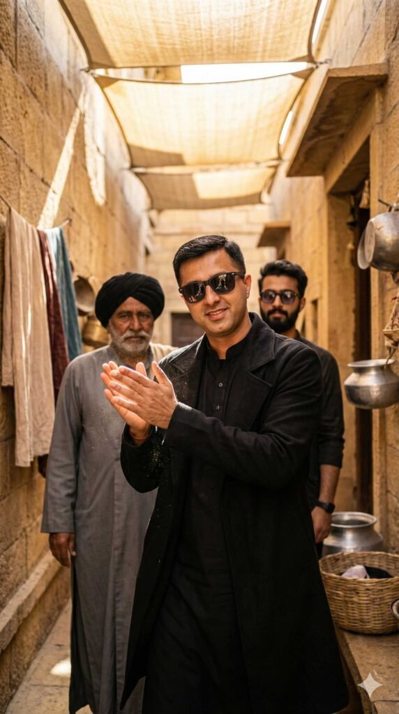 He wears the same black kurta, layered black overcoat, and dark sunglasses, fabric showing ultra-realistic folds and texture.