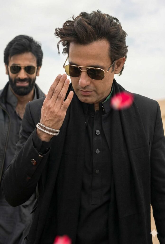 A highly detailed, cinematic photograph capturing a medium close-up of a man with windswept, dark brown hair and gold-rimmed aviator sunglasses, dressed in a black kurta, black blazer, and a black scarf, looking downwards with a serious expression. He wears silver bracelets on his right wrist, and his hand is raised near his face. In the background, slightly out of focus, another man with a beard and sunglasses, wearing a dark grey shalwar kameez, smiles. They are standing on a sandy desert dune under a cloudy, overcast sky. Red rose petals are falling and blurred in the immediate foreground. The lighting is diffused daylight, and the focus is sharp on the foreground subject.
