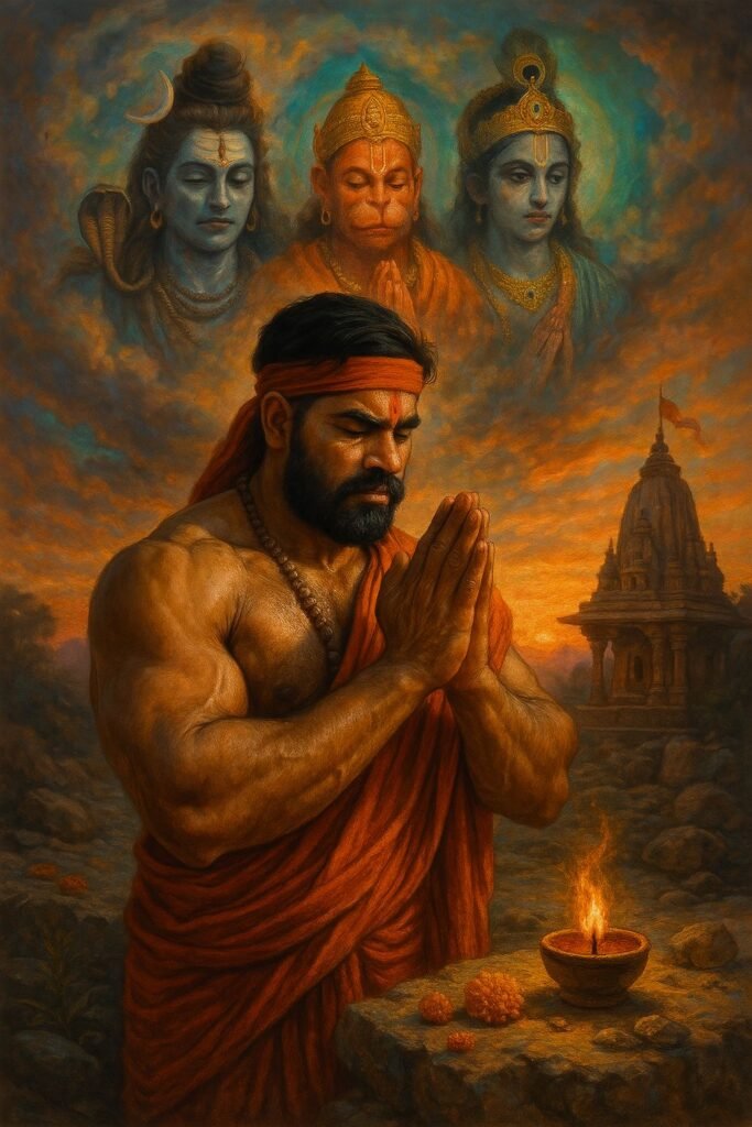 A hyper-realistic, cinematic 4K portrait of a powerful, muscular bodybuilder man wearing simple saffron-colored Hindu religious attire, draped loosely around his body in a traditional style. He is not wearing a turban, but a plain saffron headband tied across his forehead. His face must be the exact same as provided in the reference image — no alterations to facial structure, skin tone, eyes, or expression. The man is shown with closed eyes and folded hands, deeply immersed in spiritual devotion to Lord Shiva, Lord Hanuman, Lord Krishna, and Lord Sri Ram, who appear in the sky above him as glowing divine figures, radiating spiritual energy. The background is a majestic temple landscape at golden hour, with stone textures, sacred soil, a lit diya (lamp), scattered marigold flowers, a copper kalash, and a trishul nearby. A swirling seven-color aura surrounds the scene, symbolizing divine energy. The overall mood is grounded, devotional, and cinematic — evoking strength, serenity, and divine presence.