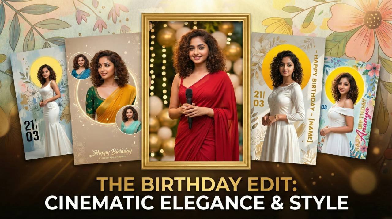 This image prompt is based on creating ultra-realistic, premium birthday posters with a modern editorial and cinematic design style. The theme focuses on elegance, celebration, and high-end visual appeal rather than casual or cartoonish birthday designs. It combines clean fashion styling, soft natural expressions, artistic backgrounds, and bold yet minimal typography. Elements like textured walls, floral illustrations, circular halos, warm lighting, and balanced layouts give the poster a luxury magazine or designer invitation feel. Such birthday poster prompts are commonly used for personal celebrations, social media posts, reels thumbnails, and print-ready designs where realism, color harmony, and facial accuracy are essential. The emphasis remains on keeping the face exactly the same as the reference image while enhancing the surrounding environment in a tasteful, premium way.