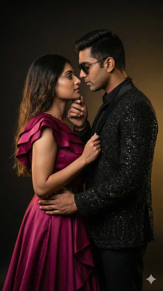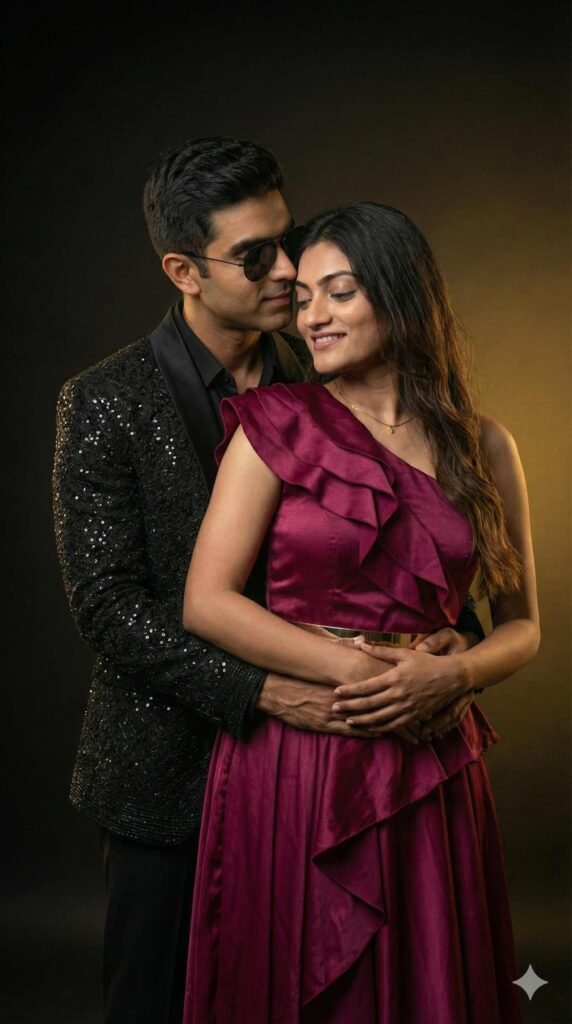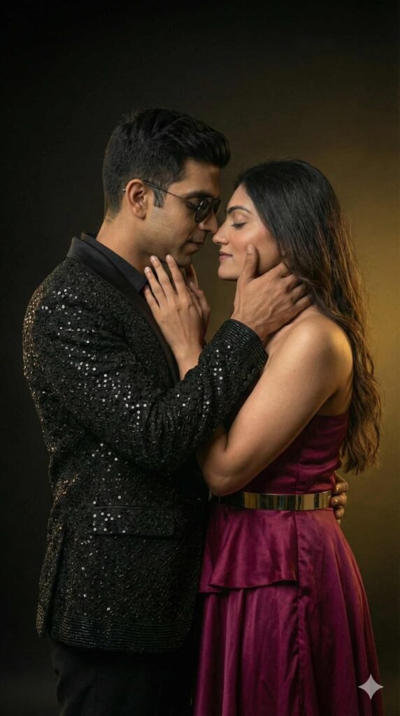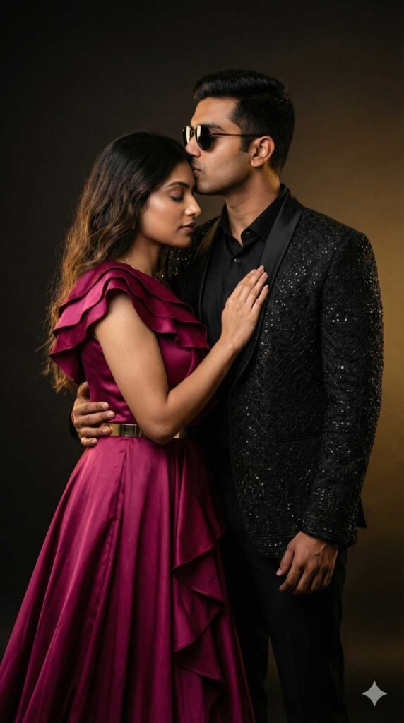 This image prompt is based on creating ultra-realistic, high-fashion celebrity couple portraits in a controlled studio environment. The theme focuses on luxury, romance, and power-couple energy, similar to premium fashion editorials, red-carpet campaigns, and magazine cover shoots. The minimalist dark background with a subtle gold gradient keeps the attention on facial expressions, body language, and expensive couture styling. The prompt emphasizes exact facial identity, natural skin texture, realistic fabric shine, and intimate yet elegant poses. Instead of decorations or props, the visual strength comes from lighting, pose chemistry, and a clean editorial composition that feels timeless, cinematic, and extremely premium.